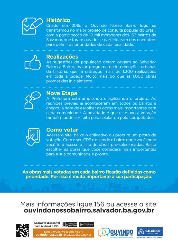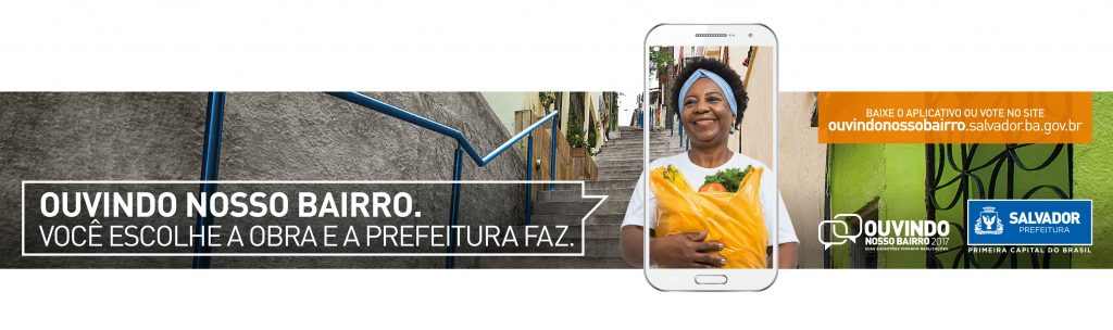 Criado em 2015, o projeto Ouvindo Nosso Bairro, da Prefeitura de Salvador, passou recentemente por uma grande reestruturação, a fim de ampliar e agilizar ainda mais os canais de consulta ao cidadão. Para divulgar, informar e engajar a população, a Ideia 3 criou uma campanha de forte apelo popular, onde os moradores aparecem como protagonistas, votando pelo computador ou smartphone. Com linguagem moderna, layouts criativos e abordagens em tom participativo, a campanha traz imagens e textos que remetem ao diálogo proposto pelo projeto Ouvindo Nosso Bairro, com peças que aproximam ainda mais os cidadãos das obras realizadas pela Prefeitura de Salvador.